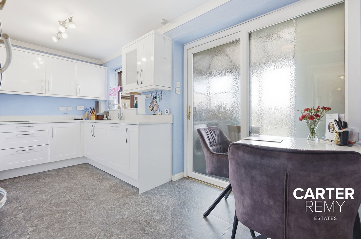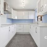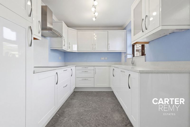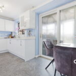 At the heart of the home is a beautifully refitted kitchen, finished with sleek high-gloss units and elegant quartz work surfaces. Designed with both style and practicality in mind, it offers ample storage, integrated appliances, and direct access to a useful utility area.